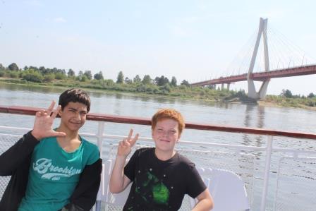 Основная достопримечательность – это конечно вантовый мост, который соединяет расположенные по разным берегам реки Владимирскую и Нижегородскую области. Фото на его фоне выглядят особенно красиво. Ребята присели только в конце прогулки, когда теплоход подплывал к пристани. Они все время только и смотрели во все стороны, переходя с носа на корму и с одного борта на другой. Прогулка окончена, но на память остались добрые воспоминания и фотографии. Благодарим ООО «Порт» за предоставленную возможность прогуляться по родной Оке.